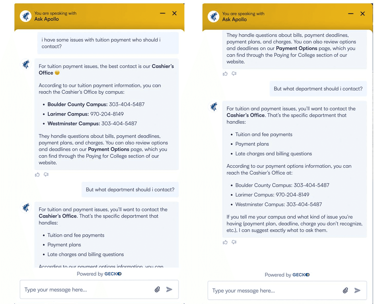 Legacy chatbot responses were repetitive and unreliable for sensitive topics like tuition—highlighting the need for a human-verified support system.
