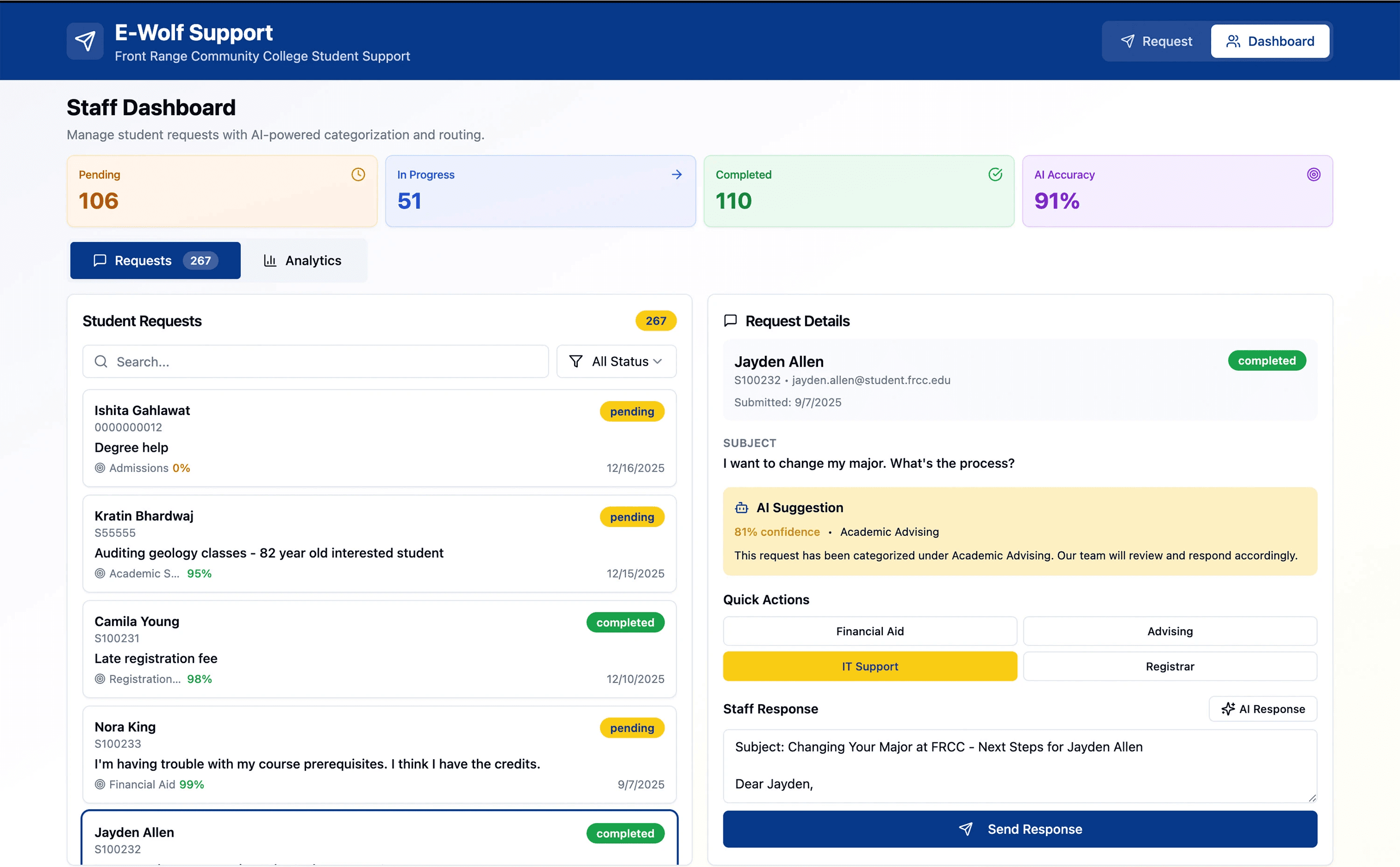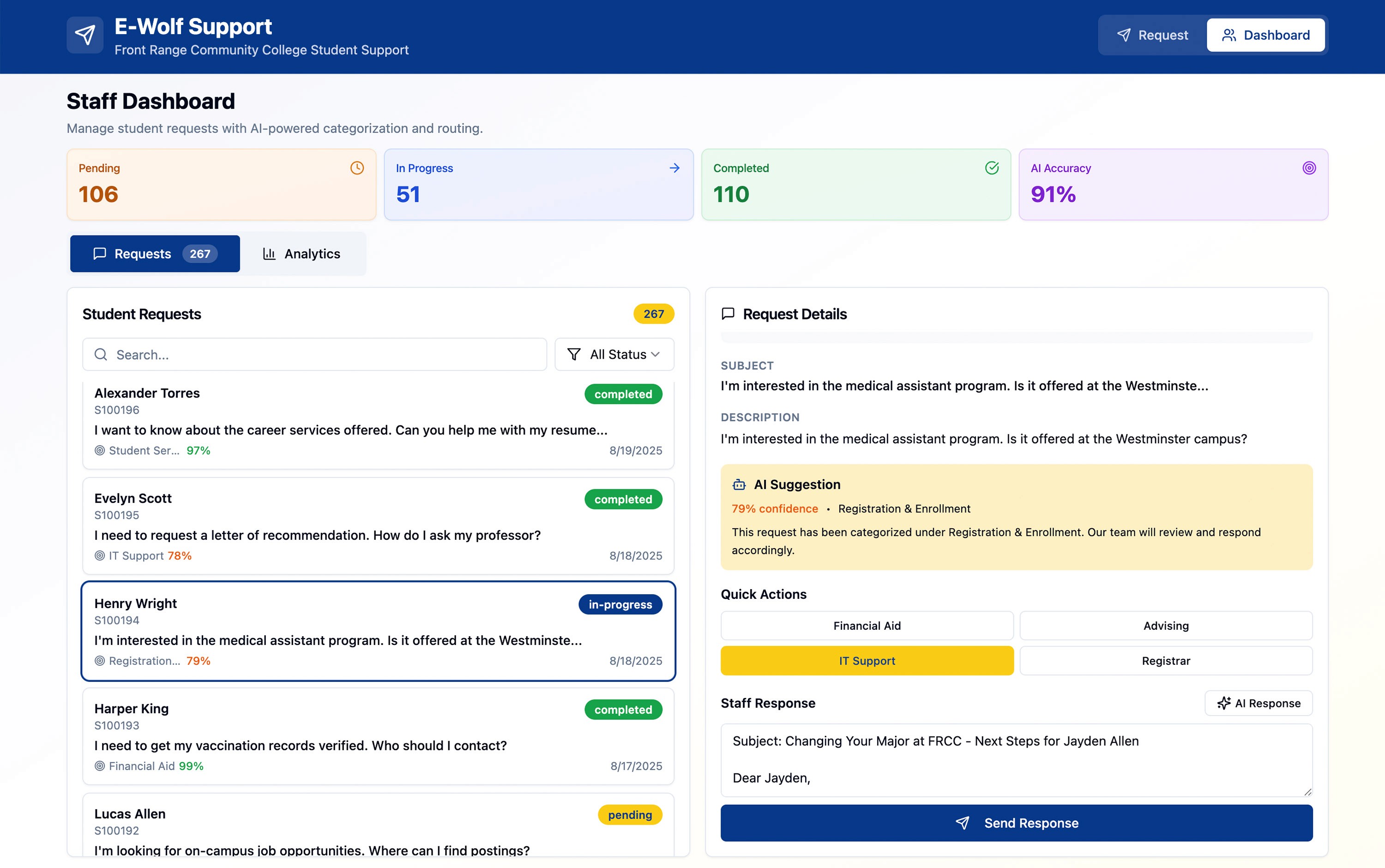 The staff-facing dashboard centralizes all student requests and layers AI assistance on top of existing workflows. The interface provides real-time visibility into workload, routing precision, and departmental trends—transforming a previously fragmented support process into a unified, data-informed operations hub.