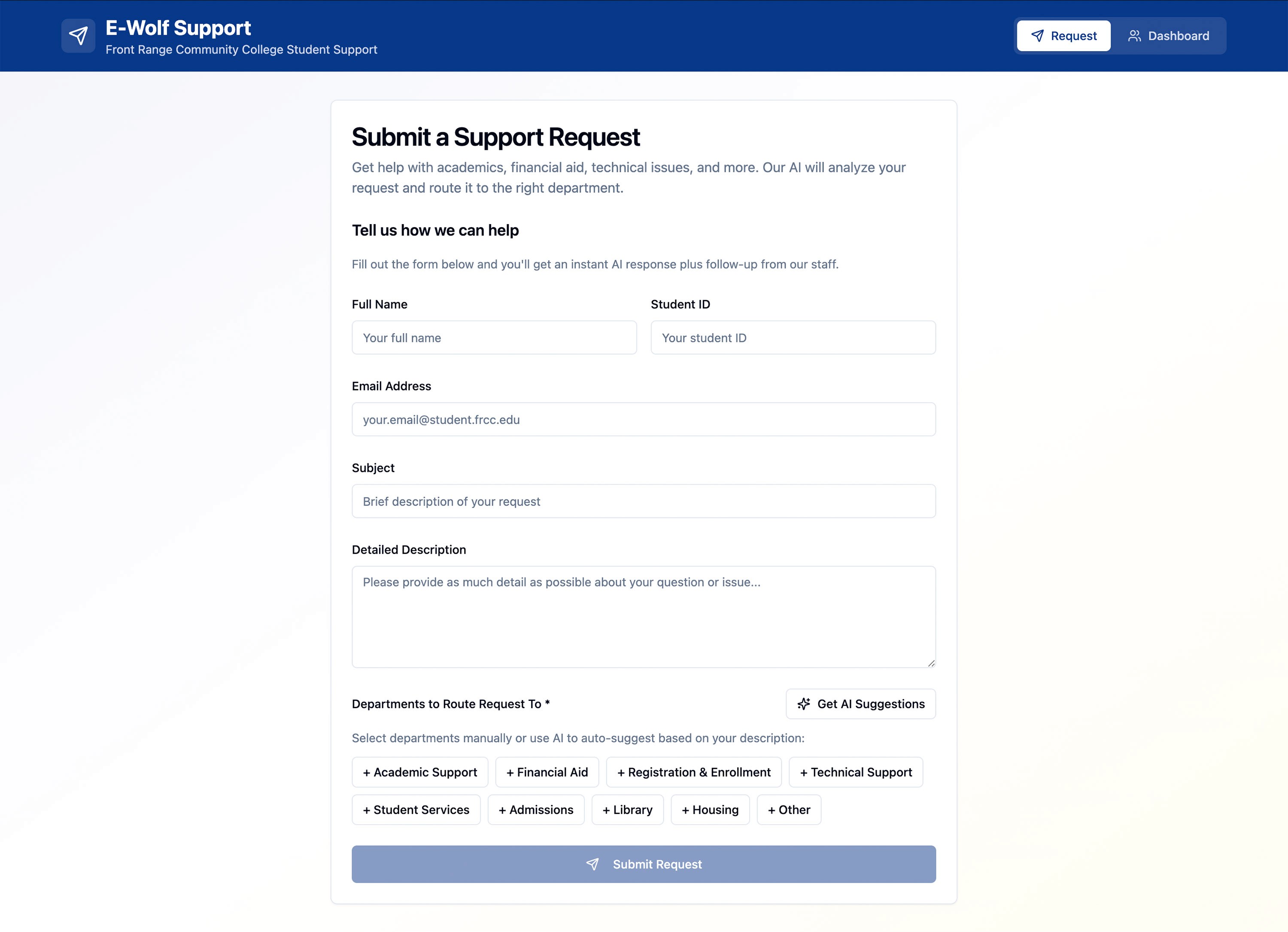 E-Wolf Support is an AI-augmented request-routing platform designed to serve FRCC’s 30,000+ students with faster, more accurate support. After analyzing the failures of the previous AI chatbot—which frequently surfaced incorrect deadlines and policy information—I designed a human-in-the-loop model where AI classifies inquiries and drafts responses while staff verify all outbound communication.