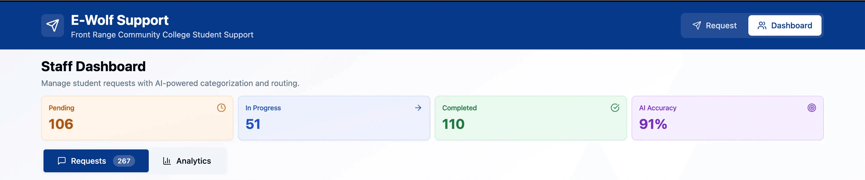 A dedicated AI Accuracy metric on the dashboard tracks model performance in real time, allowing staff to understand how reliably the system classifies requests and where manual oversight may be needed.
