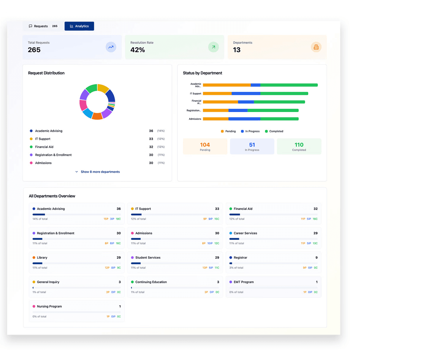 Real-time analytics summarizing request distribution and resolution trends across 13 departments.