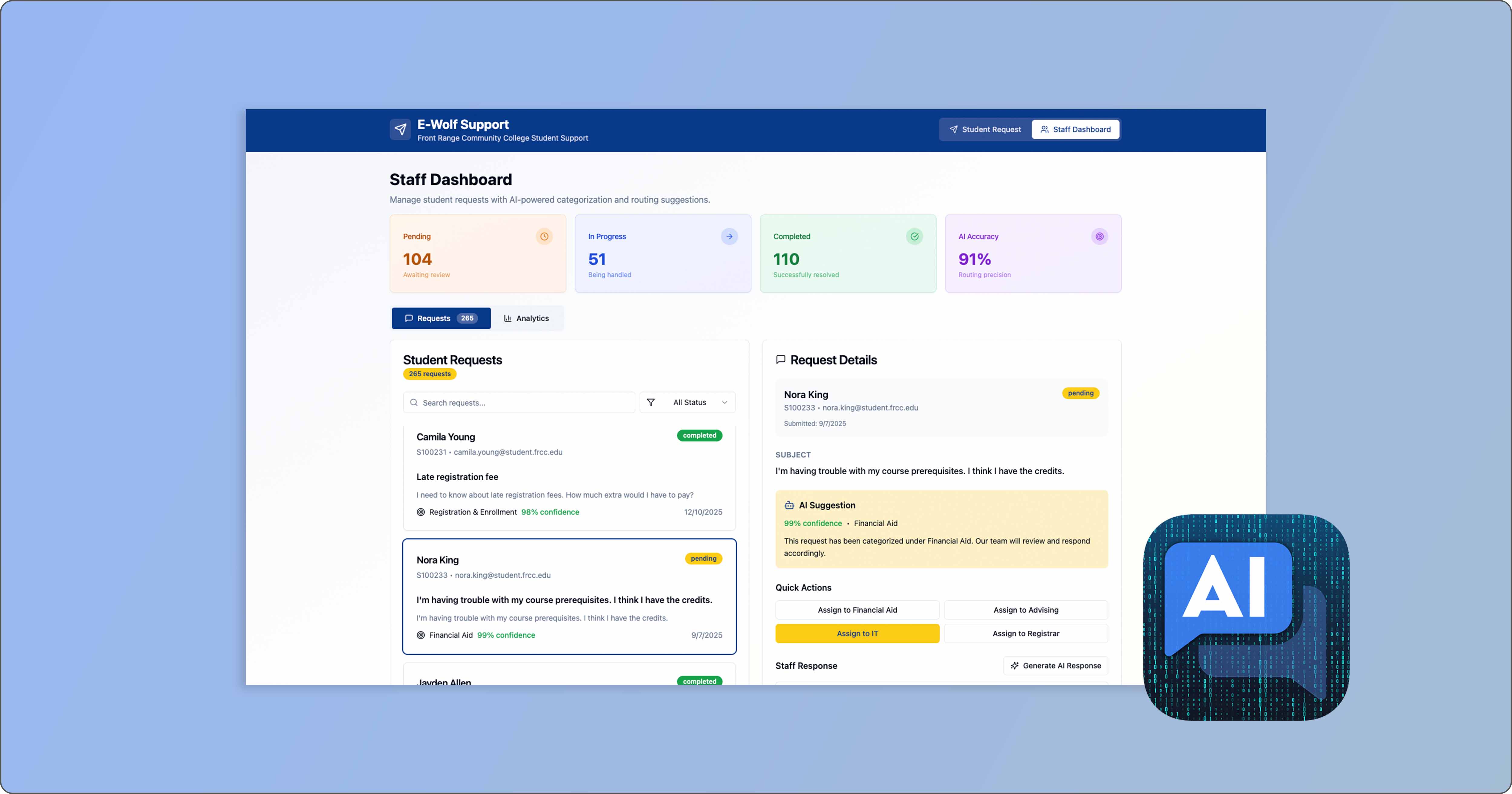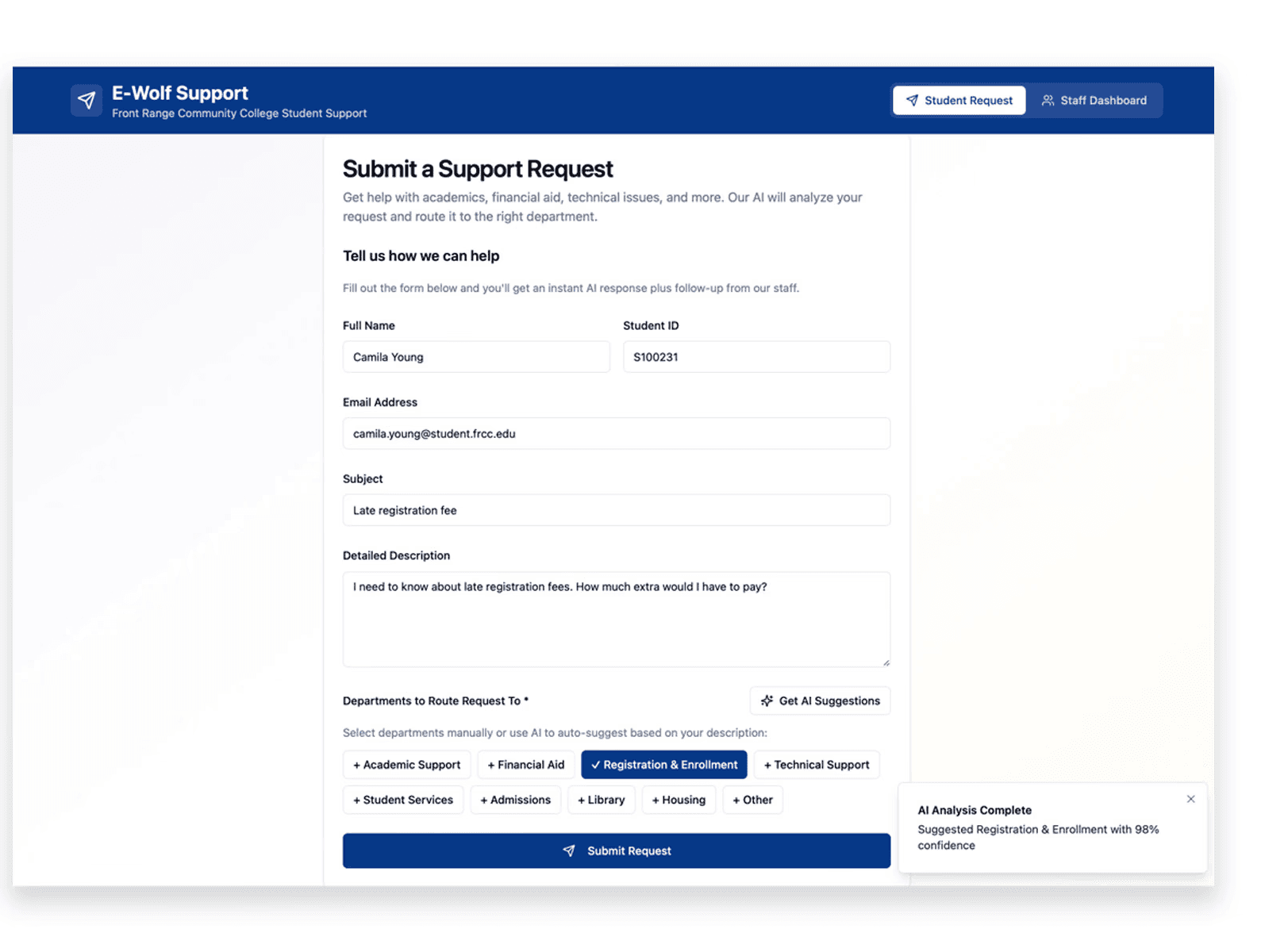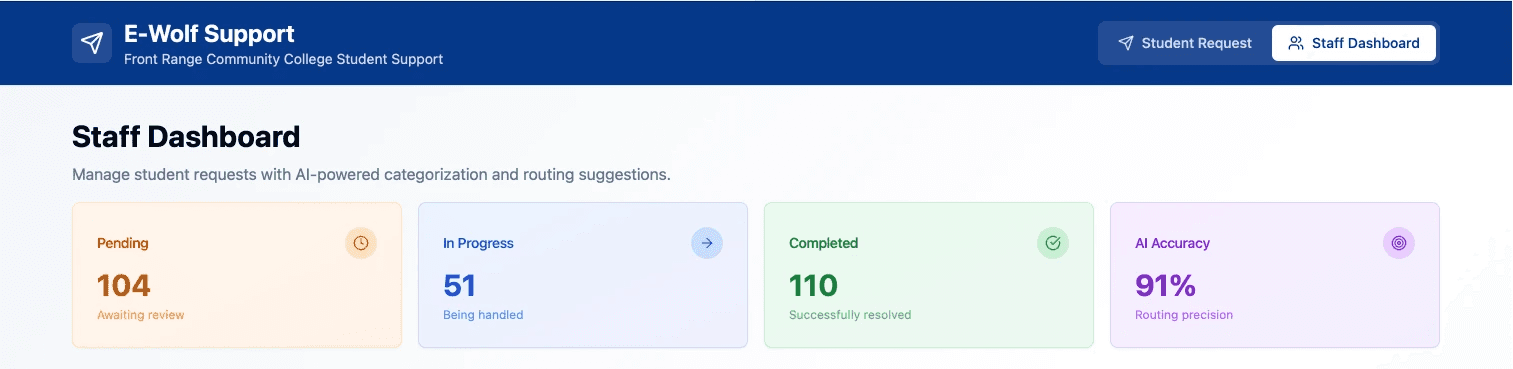 E-Wolf Support is an AI-augmented request-routing platform designed to serve FRCC’s 30,000+ students with faster, more accurate support. After analyzing the failures of the previous AI chatbot—which frequently surfaced incorrect deadlines and policy information—I designed a human-in-the-loop model where AI classifies inquiries and drafts responses while staff verify all outbound communication.