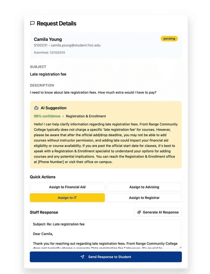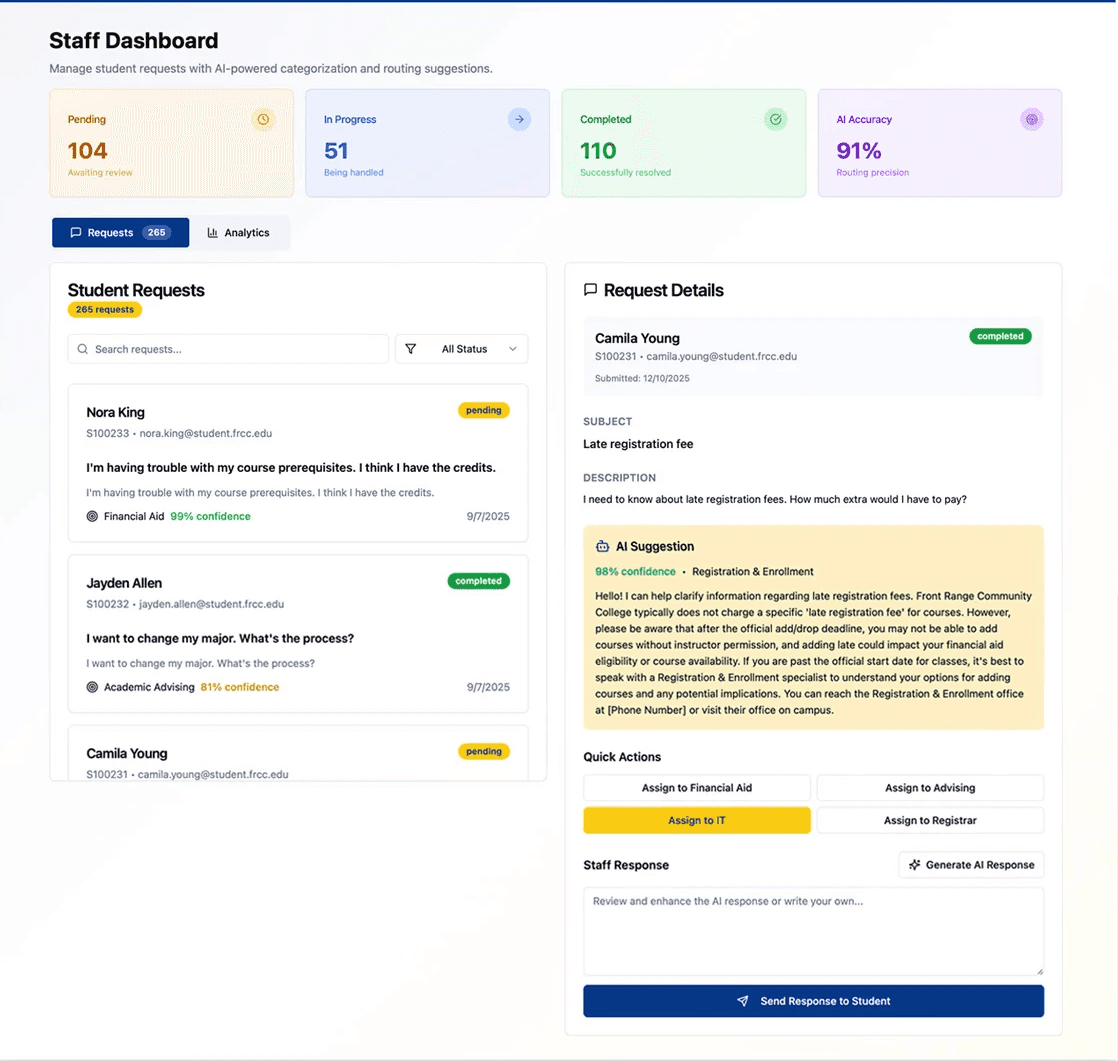 The staff-facing dashboard centralizes all student requests and layers AI assistance on top of existing workflows. The interface provides real-time visibility into workload, routing precision, and departmental trends—transforming a previously fragmented support process into a unified, data-informed operations hub.